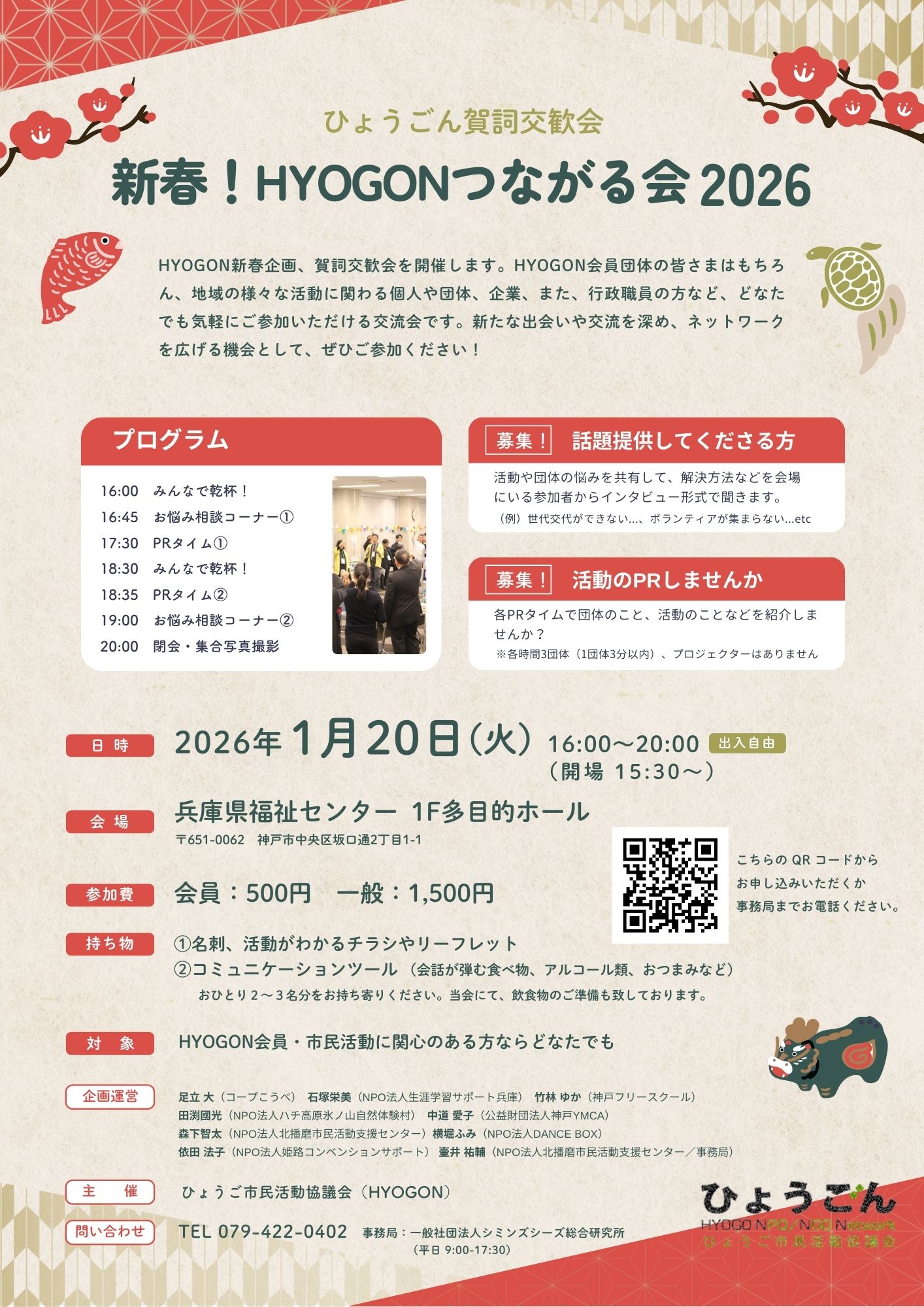 HYOGON新春企画、賀詞交歓会を開催します。HYOGON会員団体の皆さまはもちろん、地域の様々な活動に関わる個人や団体、企業、また、行政職員の方など、どなたでも気軽にご参加いただける交流会です。新たな出会いや交流を深め、ネットワークを広げる機会として、ぜひご参加ください。